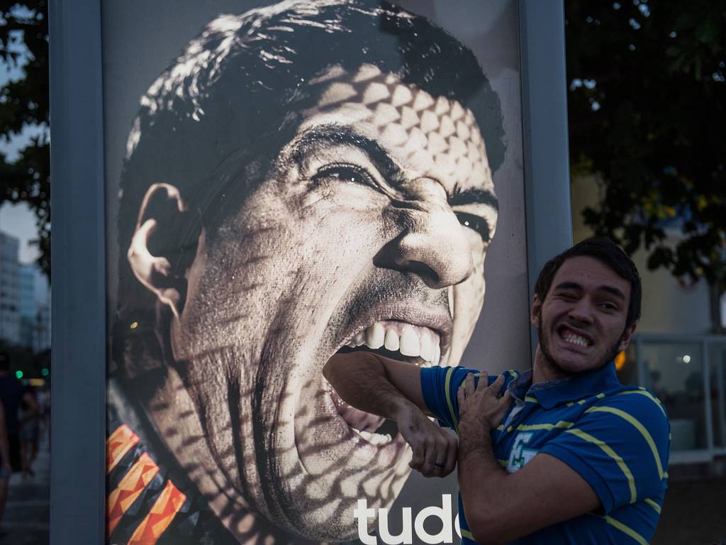 Adidas has been forced to replace an advert on Copacabana beach which features a snarling Luis Suarez. This is because ever since Suarez bit Italy defender Giorgio Chiellini it has become a big tourist attraction point. People are taking photos with it pretending to be bitten by the Uruguay striker.