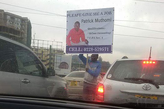 Patrick Muthomi, a Bachelor Of Commerce graduate from Chuka University, resulted in carrying a placard with his qualifications and contact details written on it then hawking his CV on Muthaiga Road. He also has reached CPA section 4.